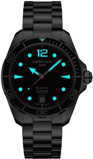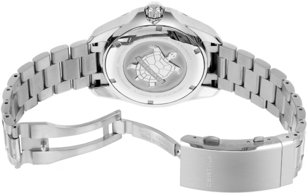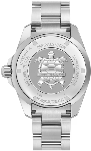 Зачем соглашаться на меньшее? Модель DS Action не идет на компромиссы. Благодаря сверхпрочному исполнению, водонепроницаемости до 30 бар (300 м) и сертификату хронометра COSC эти часы исполнят любые желания даже самых взыскательных знатоков часового искусства. Для корпуса, браслетов и застежек своих часов марка Certina использует нержавеющую сталь 316L, отличающуюся повышенной износостойкостью, устойчивостью к коррозии и гигиеничностью. В стали содержится совсем небольшое количество никеля, поэтому этот материал не вызывает аллергии при носке. Алюминий отличается высокой прочностью, гипоаллергенностью и устойчивостью к коррозии и перепадам температур. Кроме того, это чрезвычайно легкий металл: он в три раза легче стали и почти в полтора раза легче титана. Благодаря этим качествам марка Certina выбрала алюминий для производства ультралегких корпусов и застежек. Мануфактура использует только анодированный алюминий. Этот особо прочный защитный слой не только делает материал надежнее, но и позволяет окрашивать изделие в разные цвета. Super-LumiNova (SLN) представляет собой cветящийся материал с фосфоресцирующими свойствами. В темноте SLN типа BG W9, который использует Certina, испускает свет в виде голубого мерцания. SLN не вредит здоровью и используется для нанесения на стрелки, индексы и безели. В темноте он через некоторое время теряет свои фосфоресцирующие свойства, но они автоматически восстанавливаются на свету. Сапфировое стекло состоит из порошка оксида алюминия (Al2O3), раскаленного до 2.000 C. Получаемые в результате сапфировые пласты нарезаются на тонкие пластины, им придают требуемую форму и полируют. Сапфир абсолютно прозрачен, обладает высокой устойчивостью к царапинам и механическим повреждениям. По этим причинам сапфировое стекло стало неотъемлемой деталью концепции DS и используется во всех моделях Certina для защиты циферблата. Вес нетто 180 гр. Одностороннее антибликовое покрытие на сапфировом стекле. Качество сапфирового стекла повышает подавление бликов с одной или с обеих сторон. Часы марки Certina имеют высококачественное двухстороннее антибликовое покрытие, обеспечивающее оптимальную прозрачность стекла. Водонепроницаемость до 30 бар (300 м). Диаметр корпуса 43 мм. Толщина 13.67 мм. Между креплениями 21 мм. Кварцевый швейцарский хронометр ETA F07.412 с PrecidriveTM, индикатором окончания срока службы элемента питания. Название инновационной технологии, обеспечивающей исключительную точность хода изделий Certina: Точность часов с кварцевым калибром Precidrive может сравниться с хронометрами. Часы Precidrive с погрешностью до +/-10 секунд в год в 8–10 раз точнее обычных кварцевых часов. Некоторые кварцевые часы Certina – как, например, все модели Precidrive, будь то вариант с тремя стрелками или хронограф – имеют указатель окончания срока службы элемента питания (EOL). Эта функция позволяет узнать, когда завершится срок службы элемента питания: В этом случае секундная стрелка движется с интервалами в 4 секунды, и элемент питания необходимо заменить в течение двух недель. Хронометрами имеют право называться только те часы, которые прошли сложные проверки независимой комиссии и получили сертификат точности. Организация «Contrôle officiel suisse des chronomètres», коротко «COSC», это официальная швейцарская комиссия, сертифицирующая как механические калибры, так и кварцевые часы. Удлинение для на